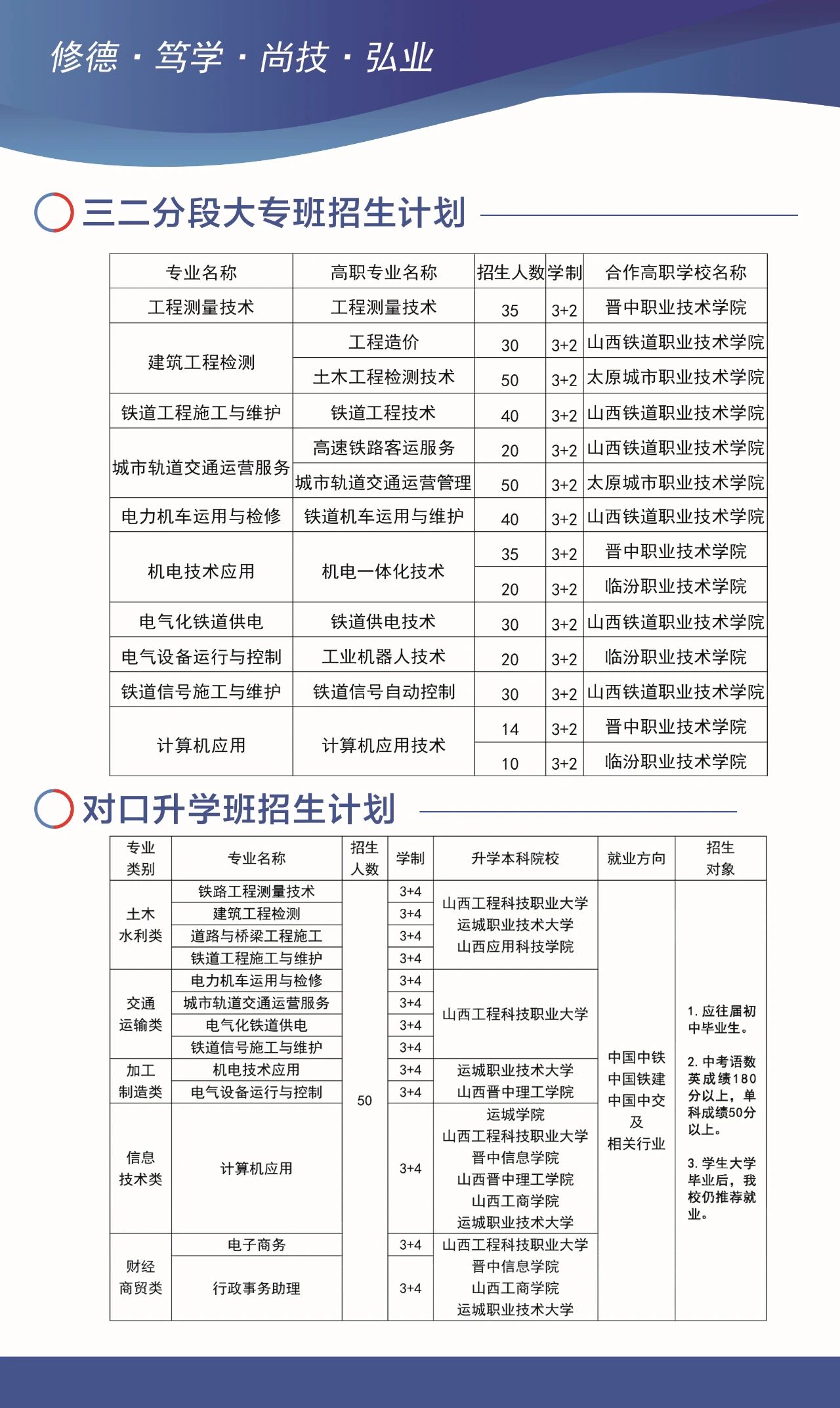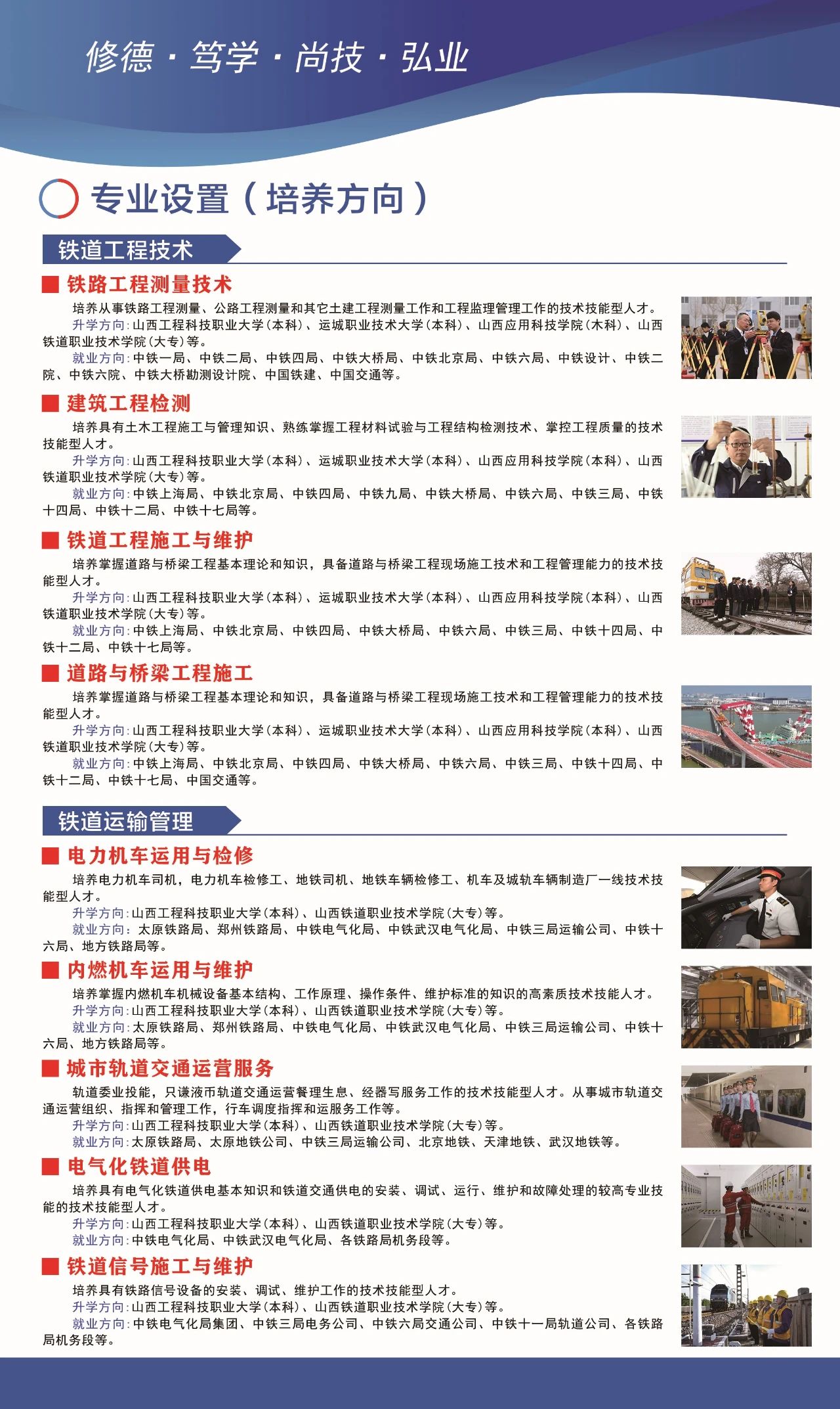 学校坚持特色就业与对口升学的双特色办学模式,就业特色鲜明,依托中国中铁、中国铁建、中国交通等大型国有铁路企业,毕业生全部安置到铁路系统、国有大中型等企业的单位工作,毕业生就业率连续三年保持在99%以上,先后有几万名学生毕业后成为技术尖子或业务骨干,部分优秀学生还走上了领导岗位;升学渠道畅通,从第一学年起开设对口升学、单招升学相关课程,采用课上辅导+个性化定制升学途径的培养模式。学生毕业可选择就业也可选择升学,就业生对口安置就业,入学即签订就业协议;选择升学的学生全部推荐升学,所有专业均可升入全日制本科或大专院校。联系方式:03545220110 / 03545220130。